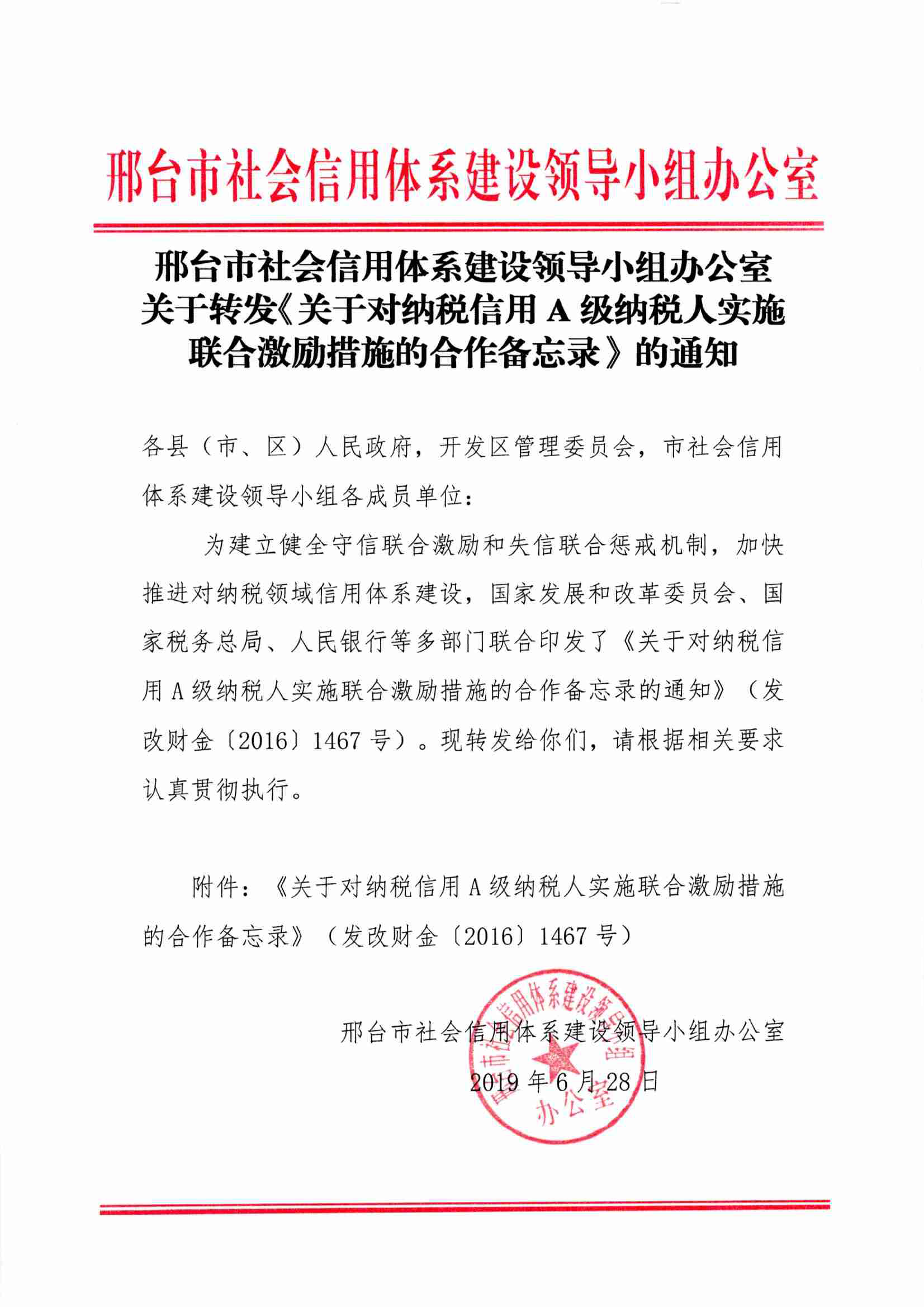 关于转发《关于对纳税信用A级纳税人实施联合激励措施的合作备忘录》的通知