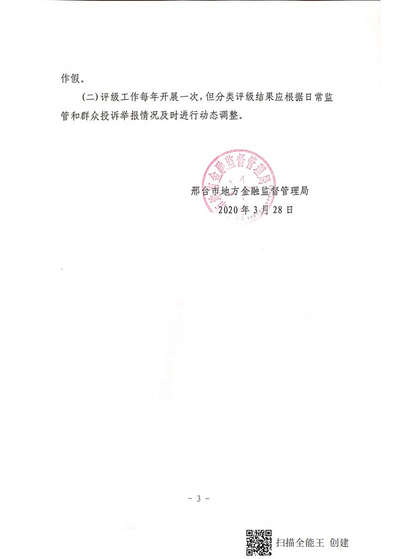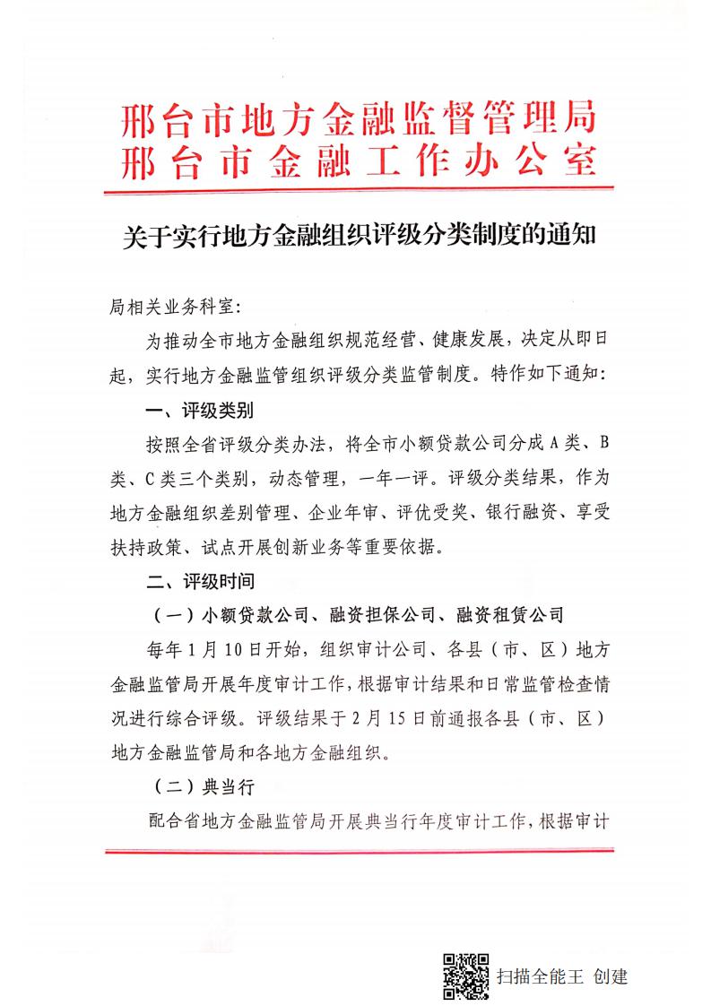 邢台市地方金融监督管理局 邢台市金融工作办公室 关于实行地方金融组织评级分类制度的通知