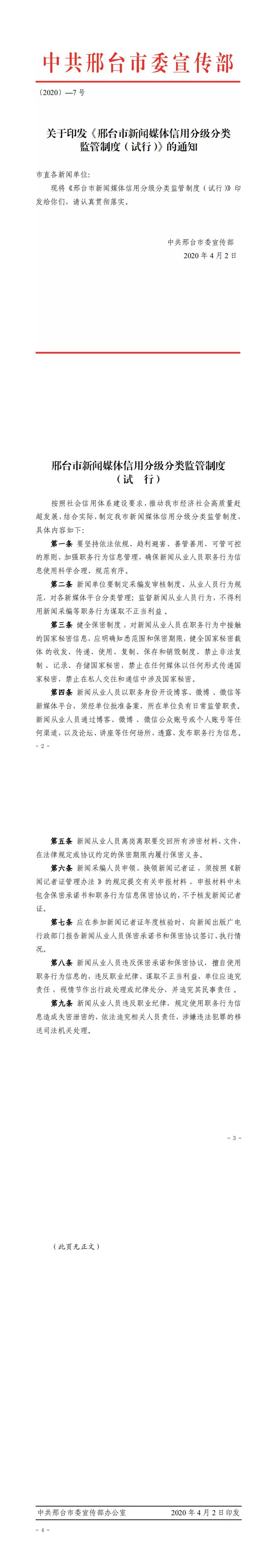 邢台市委宣传部关于印发《邢台市新闻媒体信用分级分类监管制度(试行)》的通知