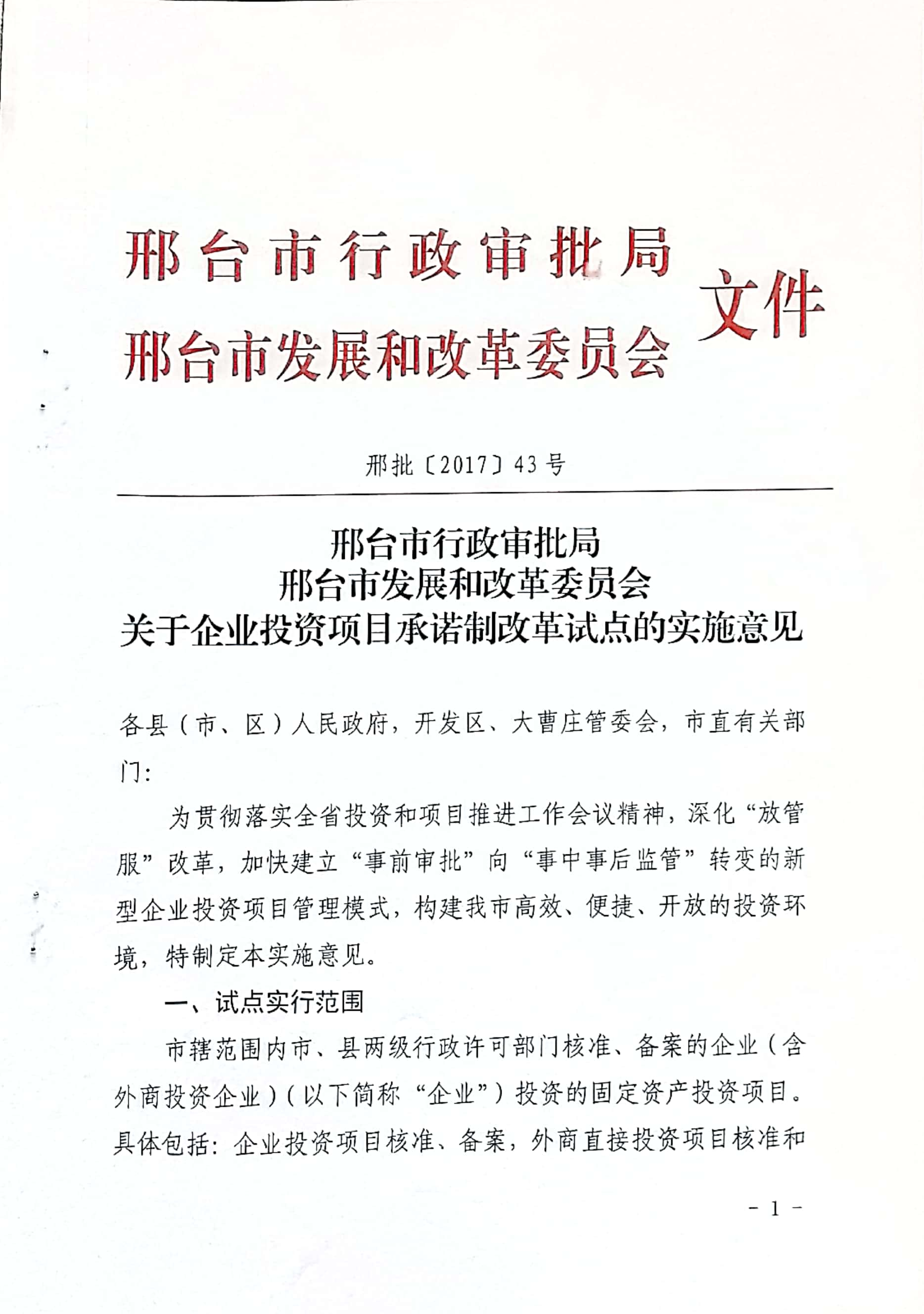 邢台市行政审批局邢台市发展和改革委员会 关于企业投资项目承诺制改革试点的实施意见
